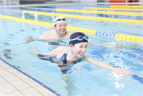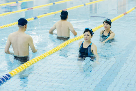 泳げない方から、競技水泳を目指す方まで、あらゆるレベルやニーズに対応しています。泳ぐためのプログラムだけではなく「水中ウォーク」や「アクアビクス」など、水の特性を活かしたプログラムも多数ご用意しています。