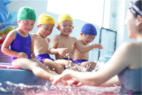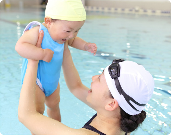 コーチの指導の下、お父さんやお母さんと一緒に抱っこやおんぶでプールを歩いたり走ったり、一人でお散歩やお顔を水につけたり。慣れてくれば泳いだりバタ足や飛び込みもします。お母さん、お父さんももプールに入ることで、日頃の運動不足やストレスの解消、お子様とのスキンシップにも効果的です。